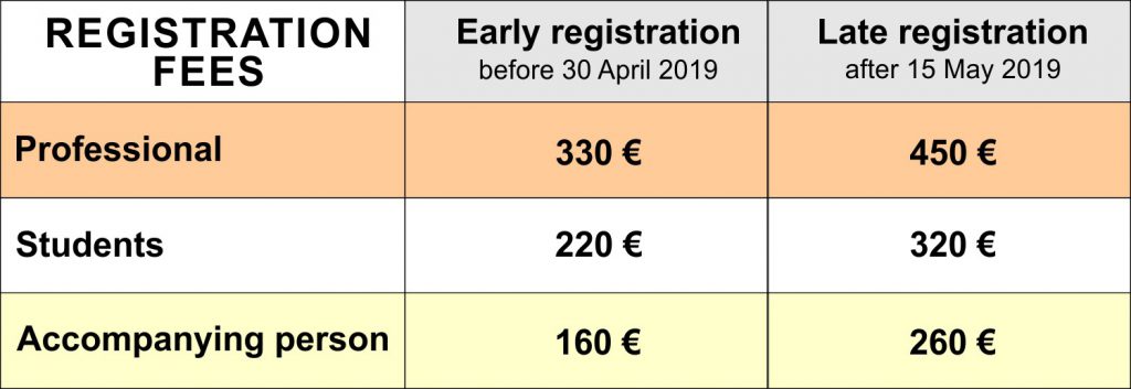 Registration fees include: welcome party, admission to scientific sessions, morning and afternoon coffee breaks, congress kit, abstract book, Proceedings volume. Total fees also include costs of field trips and social dinner (if selected).